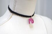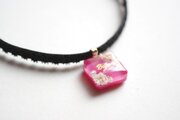 こっくりしたピンク色の背景にお花やパールを配置し、中央に文字を置いたデザインが艶やかで華やかなレジンを、ベルベットリボンにタティングレースで装飾を施したチョーカーに仕上げました。