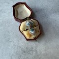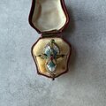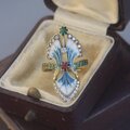 ・デザイン☞ 白と青の七宝が織りなす優雅なシルエット。中央にルビー調ストーン、上下にグリーンとクリアのCZを配し、アール・ヌーヴォーらしい植物的な造形が美しく際立ちます。