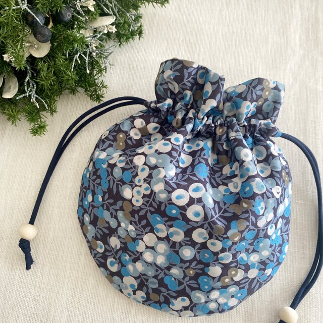 *リバティ・まるい巾着ポーチ*ウィルトシャー・ホワイト&ブルー
