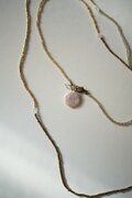 *5種類の異なる日本製ビーズをハーキマークォーツと組み合わせ、ドイツ製絹糸で柔らかく仕上げたアクセサリーです。留め具部分には淡水パールと水晶のチャームを付けております。2連ネックレスにする事も可能で、ブレスレットとしても使用できるよう長さを調整しております。