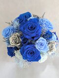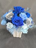 プリザーブドフラワーを白い陶器の花器に青い薔薇とブルー系の薔薇、シルバーローズ、かすみ草などでボリューム感のある豪華なアレンジに仕上げました。