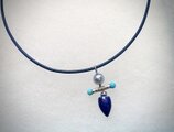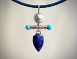 素材:あこや真珠(コバルト処理)、ターコイズ、ラピスラズリ、SV、真鍮(ロジウムメッキ)青色レザーコード付き(38+5cm)