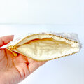 バッグの中で迷子になりがちなリップ、鍵、イヤホン、アクセサリーなどの小物をすっきりまとめられるよう、あえてマチをつけず薄型に。