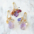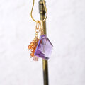 ファンシーシェイプファセットカットのアメジストを使ったピアスです。鮮やかなパープルがとても美しい透明度が高い宝石質品質の石を使っています。裏面が尖ったファセットカットで正面はテーブル面のあるフラットな形。不定形なフリーフォーム形状でとてもナチュラルな印象です。