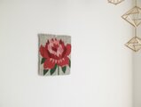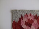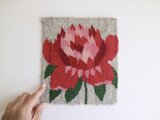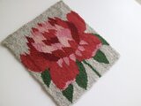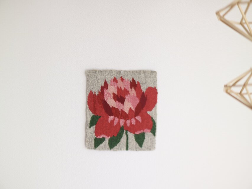 ウール糸を丁寧に織り込むことで、花びらの重なりや柔らかな立体感が生まれ、小ぶりながらも存在感のある作品です。