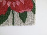 落ち着いたグレーの地に、大輪の芍薬を思わせる赤い花がふっくらと咲き誇り、濃い赤から淡いピンクまでの美しいグラデーションが手仕事ならではの表情を見せてくれます。