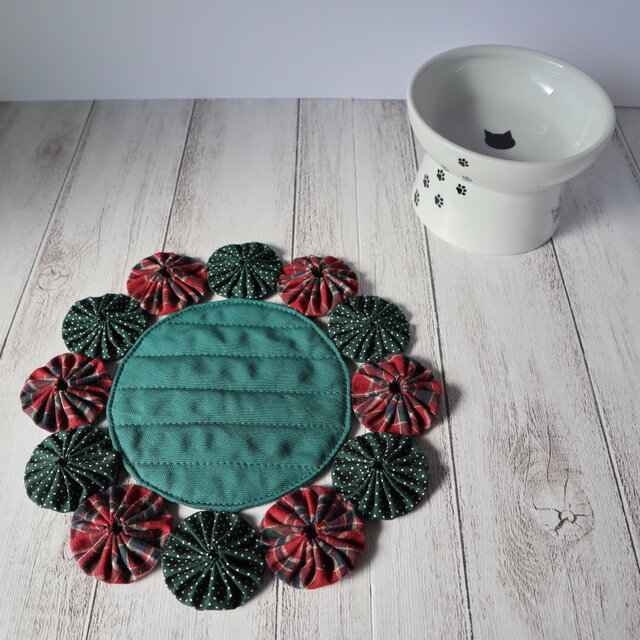 丸く裁断した布を1つずつ縫い縮めてお花のようにした、パッチワーク技法の一つ「ヨーヨーキルト」を、サークルマットに12個縫い付けてあります。