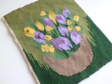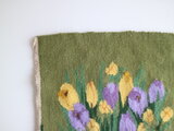 柔らかなグリーンの背景に、紫と黄色のクロッカスを思わせる春の花々が、ふっくらとした織りで表現された、心和む一枚です。