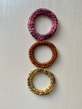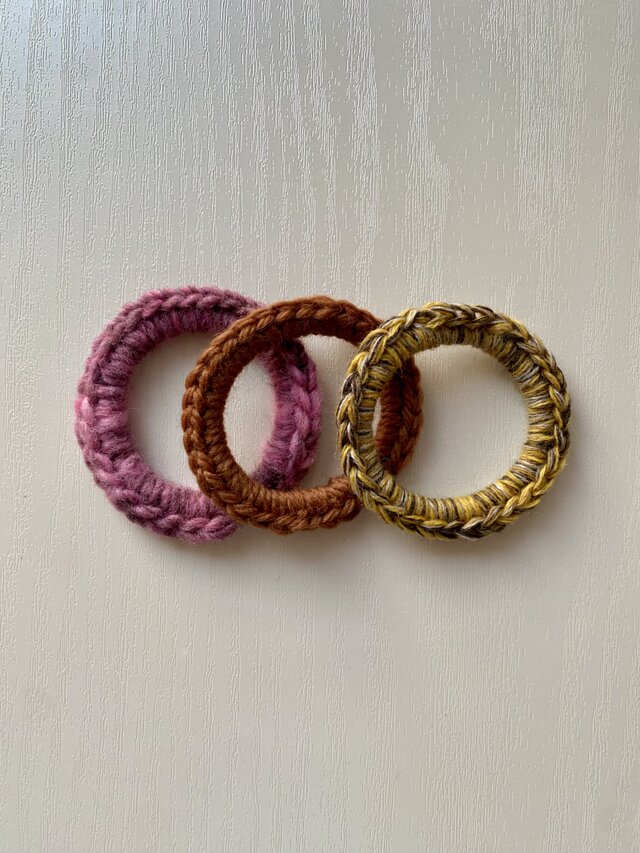 毛糸をかぎ針でぐるりと編んだヘアゴムのセットです。