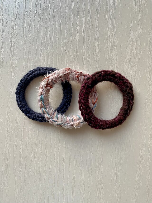 毛糸をかぎ針でぐるりと編んだヘアゴムのセットです。