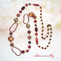 和風の花模様ビーズが印象的な、ワインレッドのロングネックレスです。