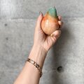 素肌に合わせることで手首を華奢に魅せ、また、薄手のニットの袖に合わせて、アームブレスレットとして、モダンに演出します。