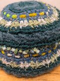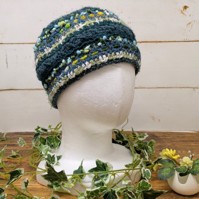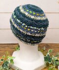 様々なグリーン系の毛糸を使って編んだ、楽しい帽子です。