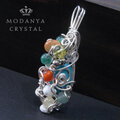 使用している石:ターコイズ12mm+ペリドット4mm+アベンチュリン4mm+イエローカルサイト4mm+マザーオブパール4mm+カーネリアン4mm+水晶64面カット4mm+カーネリアンボタン6mm