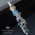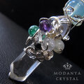 使用している石:水晶ポイント18mm+イエローカルサイト8mm+シーブルーカルセドニー8mm+パープルフローライト8mm+アメジスト4mm+アベンチュリン4mm+イエローカルサイト4mm+マダガスカルローズクォーツ64面カット4mm+シトリン4mm+水晶3mm+ヘマタイト3mm
