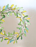 ○実…半透明の白、薄い黄緑、黄味がかった白のガラスをフュージング(電気炉でガラスを溶かして加工する技術法)にて一粒ずつ焼成し、ぷっくりした実の感じが出るようにしました。一部天然石を使用し、立体感をプラスしました。