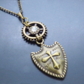 ペンダントトップは、重厚感のある盾のモチーフと、メカニカルな歯車が独創的なハーモニーを奏でています