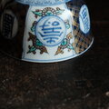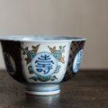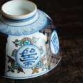 青で素敵◆花文様と漢字。伊万里 染錦金彩碗 骨董 antiques 明治期【傷有り】金継ぎなどに。
