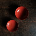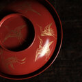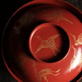朱色寄りの赤に沈金技法での飛ぶ複数羽の鶴。