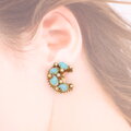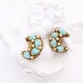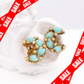 ミッドセンチュリー特有の立体的な爪留めデザインに、ミルキーなターコイズブルーのガラスカボションと小粒のミルクガラスビーズをあしらった華やかでクラシカルなスタイルです。
