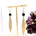 深いブラックカラーのビーズと、繊細なテクスチャーが刻まれたロングリーフモチーフのゴールドチャームが揺れる、洗練されたデザインです。
