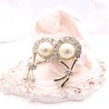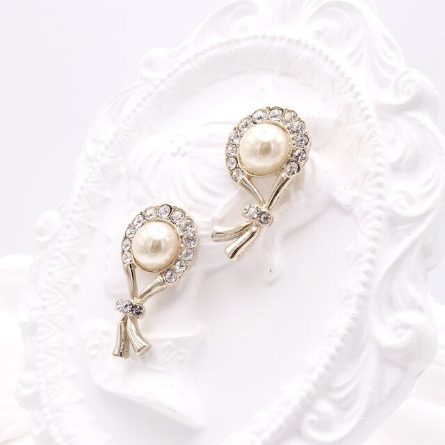 柔らかな照りを持つパールを中心に、クリアラインストーンが花冠のように囲み、その下には小さなリボンモチーフが添えられています。