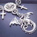 スチームパンク風のアンティークシルバー(銀古美色)のドラゴンと歯車のネックレスです