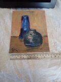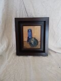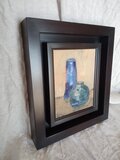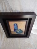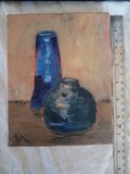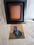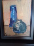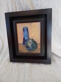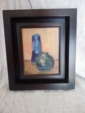 ドラマチックなダークトーンの木製フレームに収められた、2つの陶器の花瓶を描いたこのシンプルな小さな油絵は、モダンな家によく合います。