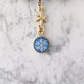 雪の結晶は直径8mmのミール皿にアクリル絵の具で手描きしてレジンで硬化させています。3層の重なりですが、よく見ると奥行きを感じていただけると思います。シール素材の雪の結晶を使うつもりだったのですが、奥行き感が出ないため、帯留めを作る時と同じように手描きをしています。できるだけ、長く使っていただけるように、また、奥行き感、透明感、美しさが損なわれないようにレジン作品にはアクリル絵の具、パステルとレジン液以外は使わないようにしています。そのため、雪の結晶シールを泣く泣くあきらめて手描きしています。シールとは違う味わいを感じていただけたら嬉しいです。