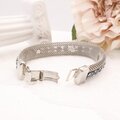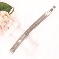 繊細なシルバーメッシュチェーンが手首にしなやかに馴染み、中央にセッティングされた淡いライトブルーラインストーンが上品な輝きを放ちます。