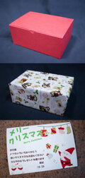 赤い箱に入れてクリスマスのラッピングをし、緑のリボンを掛けます。