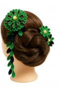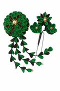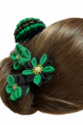 This hairpin features an elegant contrast of green and black, created with traditional Tsumami-Zaiku techniques.