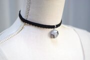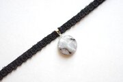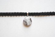 白とグレーのマーブル模様のレジンに白と黒でラインを引いた、天然石風の模様が独特のニュアンスを生んでいるレジンを、ベルベットリボンにタティングレースで装飾を施したチョーカーに仕上げました。