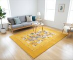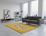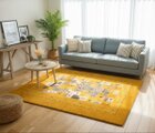 このラグの最大の魅力は、その鮮やかでありながらも品格のある黄金色にあります。