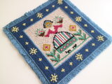 民族衣装を着た女の子が、花かごを両手に持って立つ可愛らしいデザイン。細かなステッチで丁寧に表現された1枚で、北欧らしい素朴さとあたたかさがぎゅっと詰まっています。