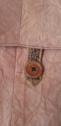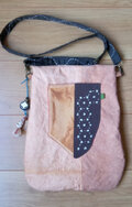 偶然出来た柿渋染めの布の形がバックに見えました。表は帯芯を染めたもので木綿、内袋は泥大島を使って絹です。蓋を開けるとちらりと見える大島がおしゃれかなと思います。