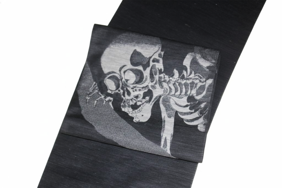 ■織りの表現力 絹の光沢と麻の質感が交差する「麻絹」の地色に、髑髏の骨格一つひとつを緻密に表現。モノトーンの中に宿る迫力は、西陣の職人ならではの仕事です。浮世絵ファンのみならず、アンティークや個性派の着こなしを愛する方に捧げる逸品です。