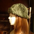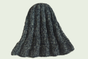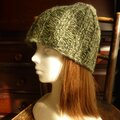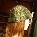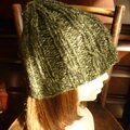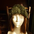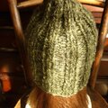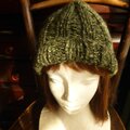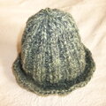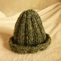 グリーン系の交じり糸で編んだ広めのゴム編みの帽子です。
