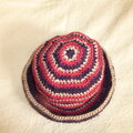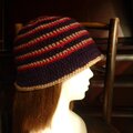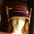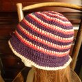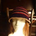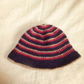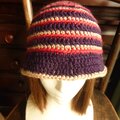 紫、えんじ色、ベージュの3色のボーダー柄でチューリップハットのような形をかぎ針で編みました。