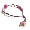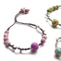 コロンとした可愛らしいインドで制作された手作りの古布ビーズと、程よい透明感の天然石マザーオブパールの優しい輝きを組み合わせた1点もののマクラメブレスレットです。