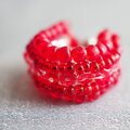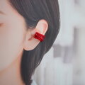 2種類の赤のビーズ、1つは透明感のある赤、もう1つは真ん中に光沢のある赤のビーズの中心に、小さなスパンコールを施したビーズが並んだ、少し幅のある、存在感のあるイヤーカフです。