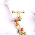 ロープ状に編み込まれたゴールドトーンのメタルに、深みのあるレッドとターコイズグリーンのカボションストーンが交互にセットされ、クラシカルで立体的な表情を生み出しています。