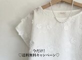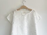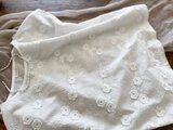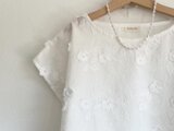 薄手のローン地に、立体的なお花が刺繍されたとても凝った一品です。女性らしさがいっぱい詰まった、優しいお洋服です。