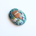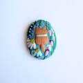 サーモンピンクの地に黒い花の刺繍、ありそうでなかったこの色のとりあわせ、すてきなブローチでした。