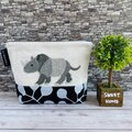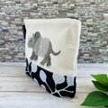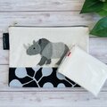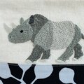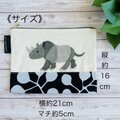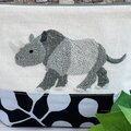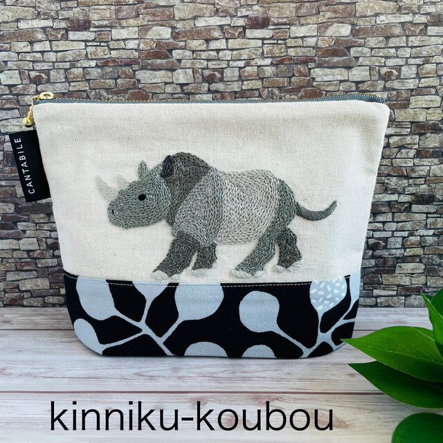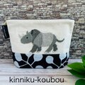 横から見たサイを刺繍した、折りマチのポーチです。