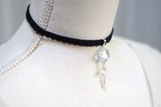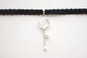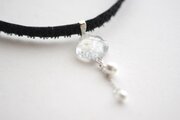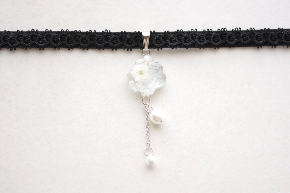 凹凸のレジンにお花とパールを封じ込めシルバーで装飾したレジンを、ベルベットリボンにタティングレースで装飾を施したチョーカーに仕上げました。