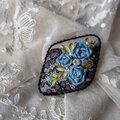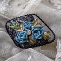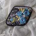 グレージュリネンに黒のアンティークレースをかぶせ、リボン刺繍で薔薇を刺し、パールビーズ、ラインストーンをのせたブローチです。