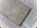・革はアラスカレザーです。アラスカレザーは、硬さを感じる張り感の中にも柔らかさがあり、使い込んでいくのが楽しい革です。革の表面にはワックスがのっています。ブルームと言って白っぽい蝋(ロウ)が吹き付けられており、雪山のような見た目からアラスカと名がついた上質なイタリアンレザーです。この蝋(ロウ)はお手が触れるところから徐々に溶けて艶へと変わっていきます。