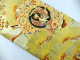 ■100年前の帯としては状態が良いですがキナリ色部分に薄染みがある物もごさいます。柄が混んでいるので目立つダメージではございませんがアンティーク帯からのリメイクですのでご了承の上お求めください。古さ加減を楽しみたい方に良いかと思います。鳳凰笠松文様の吉祥文です。裏は他の帯中無地(絹)を使用し中央にワンポイント別柄布を足しました。両面使用できます。