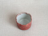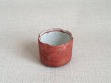 この作品は、粗めの信楽の土を使いろくろで作ったぐい呑みに、丁寧に赤絵付をして金で葉紋を描き焼成を重ねています。赤絵付はあえて均一にせず手仕事の温かさが感じられるように仕上げています。内側は白い釉薬をかけ、赤い線を入れています。中に入れたものが映える色味です。口縁は花形で滑らかな口当たりです。